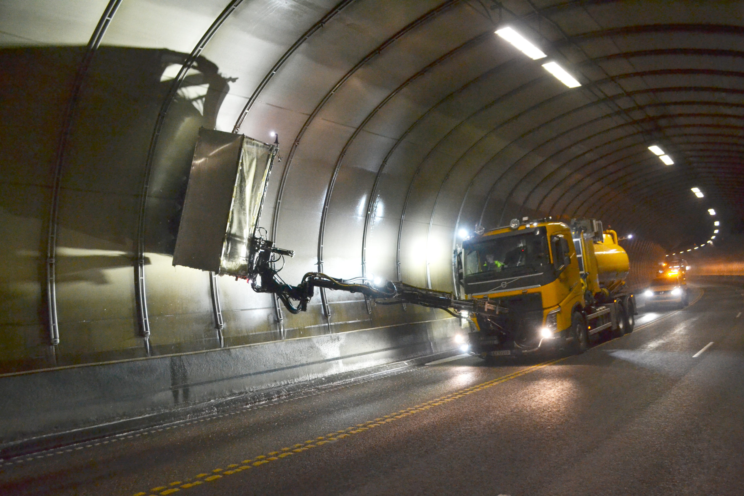 Som en del av våre kontrakter med Statens vegvesen og fylkeskommunene, vasker vi jevnlig et stort antall tunneler over hele landet. Vi bruker spesialbygde maskiner, slik at vi kan jobbe mest mulig effektivt og gjøre en grundig jobb på minst mulig tid.