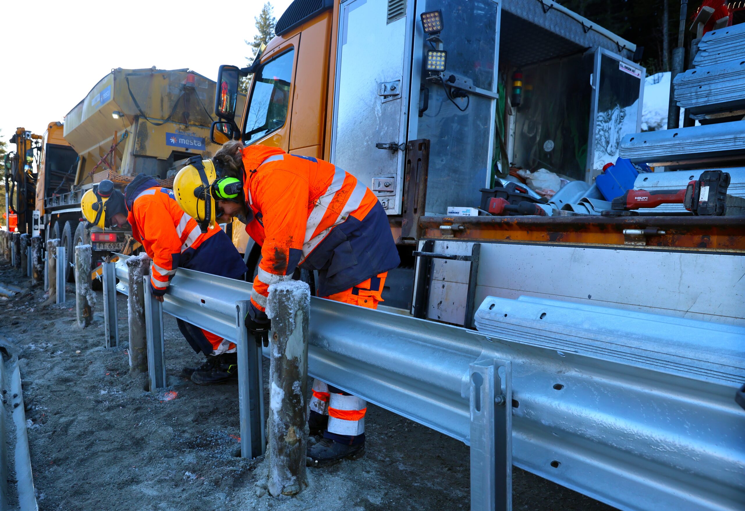 Maskinen borrer ned i bakken på riksveg 4 mellom Oslo og Gjøvik. Ett av Mestas rekkverkslag er på jobb. Det er vinter og ganske lite tele, men det skal likevel bores dypt for at rekkverkstolpene skal være stødige nok. Arbeidslaget på fire har god kontroll på arbeidsoppgavene. Internt i Mesta kaller de seg «rå på rekkverk», og jobber seg framover med en god del meter per dag. Varselskilt, lys og sikring rammer inn arbeidslaget. Lufttrykket fra bilene og vogntogene som kjører forbi merkes godt.
